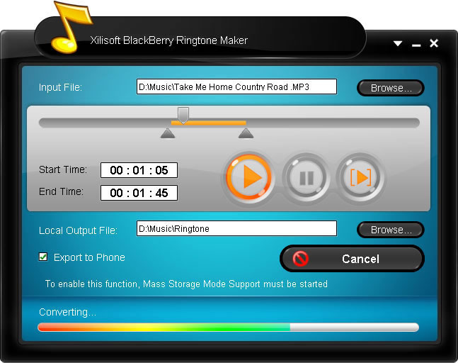 Supporting almost all video and audio formats including AVI, MPEG, WMV, 3GP, WMA, WAV, RA, M4A etc., Xilisoft BlackBerry Ringtone Maker provides a fast and easy-to-handle way for you to create BlackBerry ringtone from any video/audio in your multimedia collection. Not only a BlackBerry ringtone generator, Xilisoft BlackBerry Ringtone Maker is also a ringtone transfer to transfer the converted MP3 file to your BlackBerry memory card automatically when the conversion is finished as you like.
