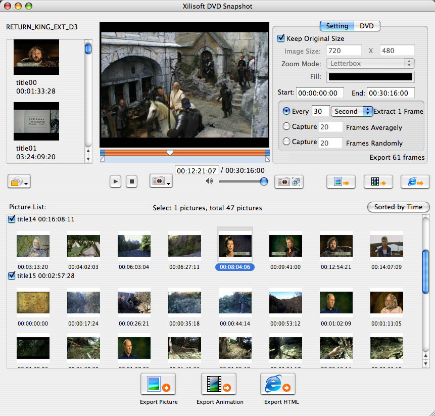 Really love some pictures in Home DVD movies and wanna capture photos from DVD? Now you get Xilisoft DVD Snapshot for Mac to help you. Owning great capabilities to capture photos from DVD-Video, the Home DVD image capture program for Mac can capture Home DVD image and output them as static pictures in JPEG, PNG, GIF, BMP, GIF and Flash animation. Outputting captured Home DVD pictures as HTML page is very convenient for viewing and sharing with friends.