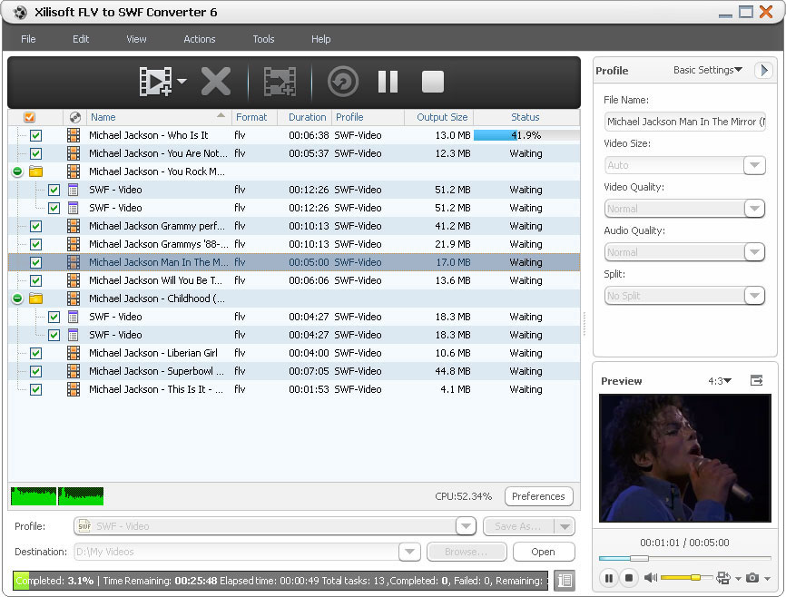 To enable the output SWF videos to be played normally, Xilisoft FLV to SWF Converter will automatically split large file every 16000 frames. Aside from this, you can adjust the output SWF video parameters like video/audio quality, frame rate, bit rate, sample rate and so on to make the Flash SWF videos fit streaming media better.