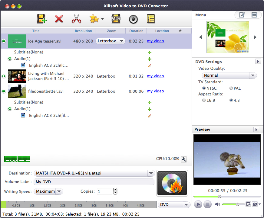 Xilisoft Video to Home DVD Converter for Mac is designed to convert all video files in all sorts of formats including high-definition videos to Home DVD movies and make them into DVDs. You can also create ISO files and Home DVD folders with this great video to Home DVD converter for Mac.